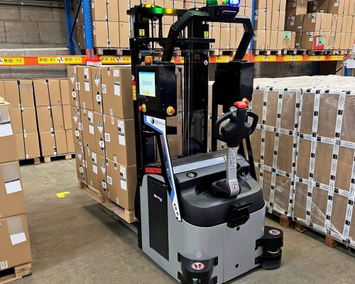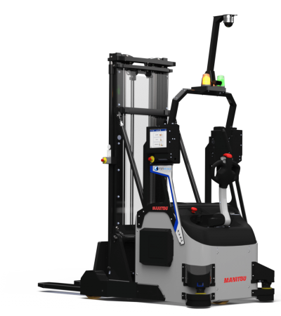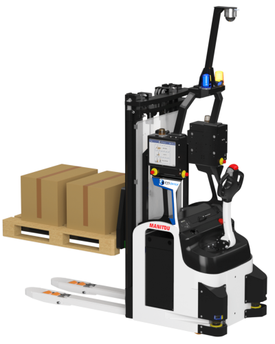 Vybaven několika senzory se bezpečně pohybuje ve smíšeném prostředí spolu s operátory a dalšími stroji.