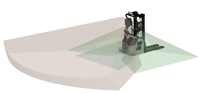 3D kamerami pro detekci vysokých nebo nízkých překážek, jako jsou vidlice vysokozdvižného vozíku