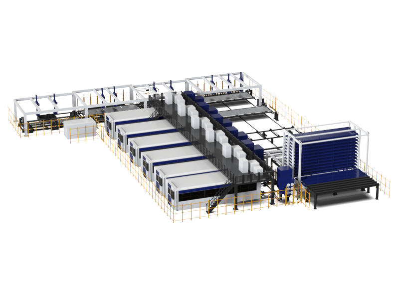 Flexibilní výrobní linka pro laserové řezání se skládá z jednoho nebo více laserových řezacích strojů, automatizovaného skladování materiálu, automatizovaných systémů nakládání a vykládání, monitorovacích systémů atd. Modulární konstrukce a inteligentní řízení umožňují síťovou správu systému.